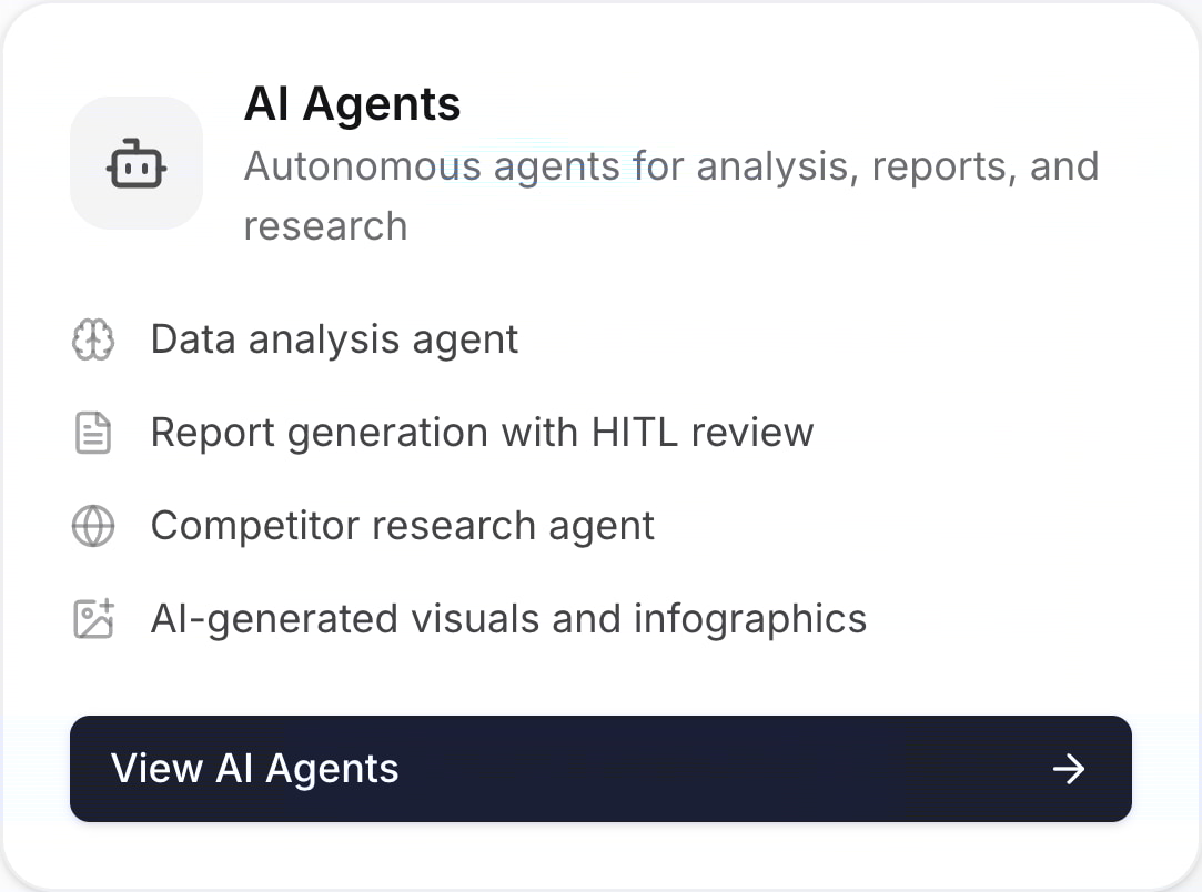 AI 代理会在后台处理您的数据和市场信息:自动生成最新报告,监控竞争对手,并提供随时可供查阅的分析结果。